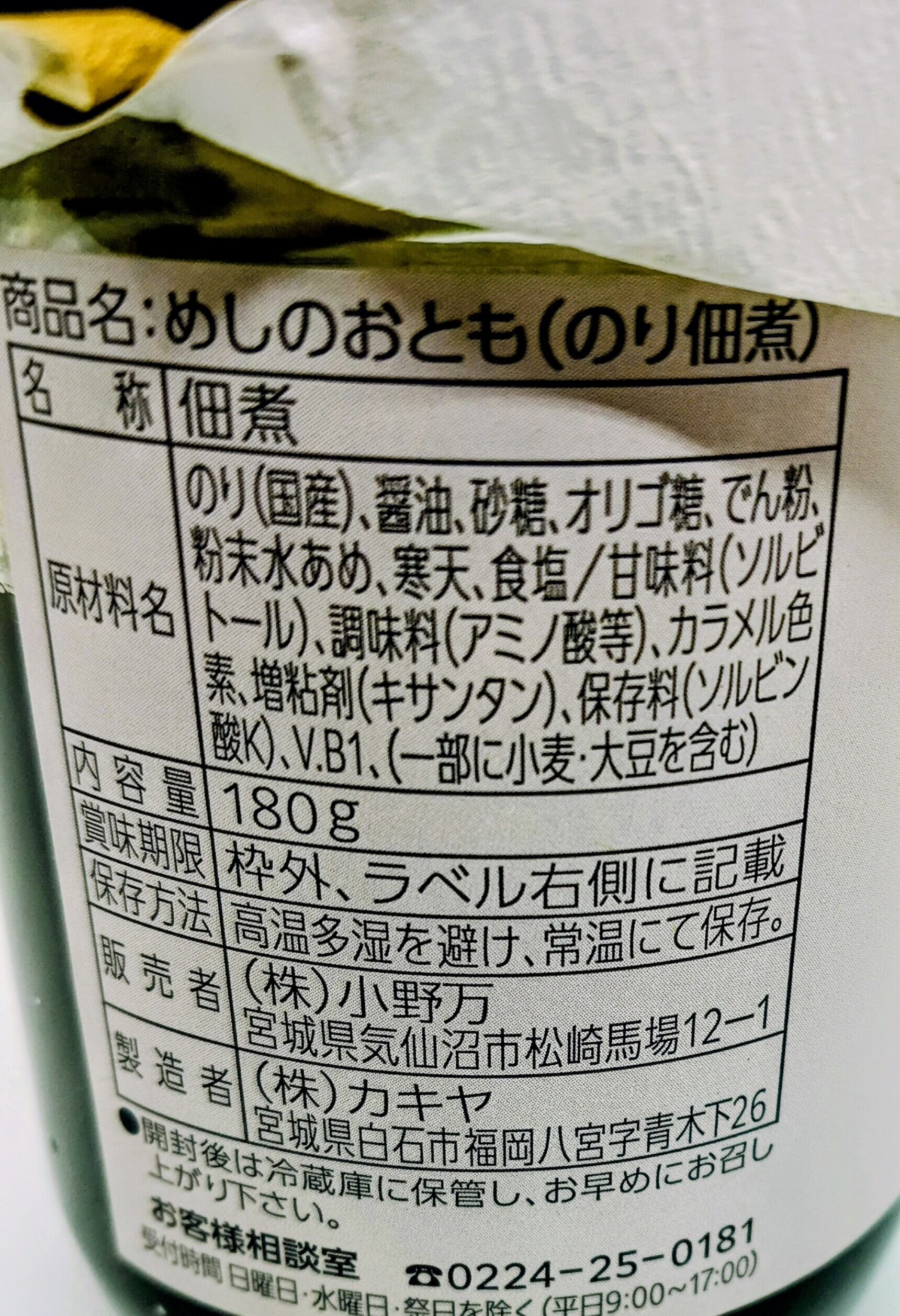 【原材料名】のり(国産)、醤油、砂糖、オリゴ糖、でん粉、 粉末水あめ、寒天、食塩/甘味料(ソルビ トール)、調味料(アミノ酸等)、カラメル 素、増粘剤(キサンタン)、保存料(ソルビン 酸)、V.B1、(一部に小麦・大豆を含む)